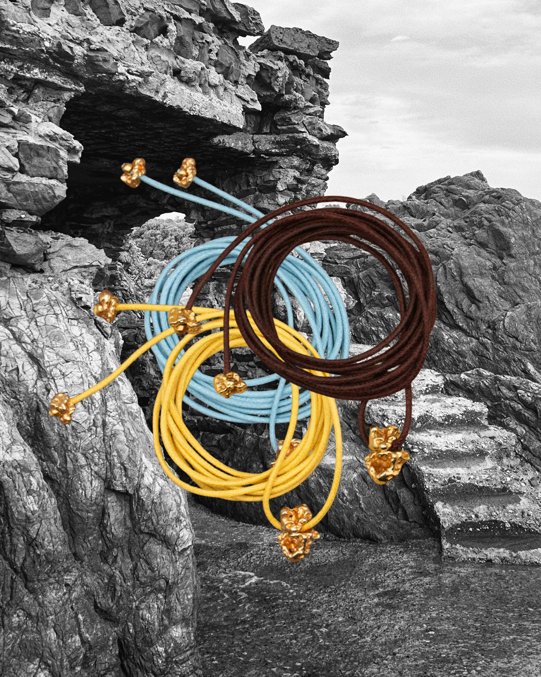 Le collier Fragment est composé de formes organiques qui proviennent d’un bijou d’une marque vintage des années 1980. À l’atelier, je l’ai démonté, retravaillé, puis assemblé sur un long cordon en coton coloré, pensé pour s’enrouler plusieurs fois autour du cou. Je l’aime encore plus lorsqu’il s’accumule avec d’autres bijoux dorés, comme le collier Poma.